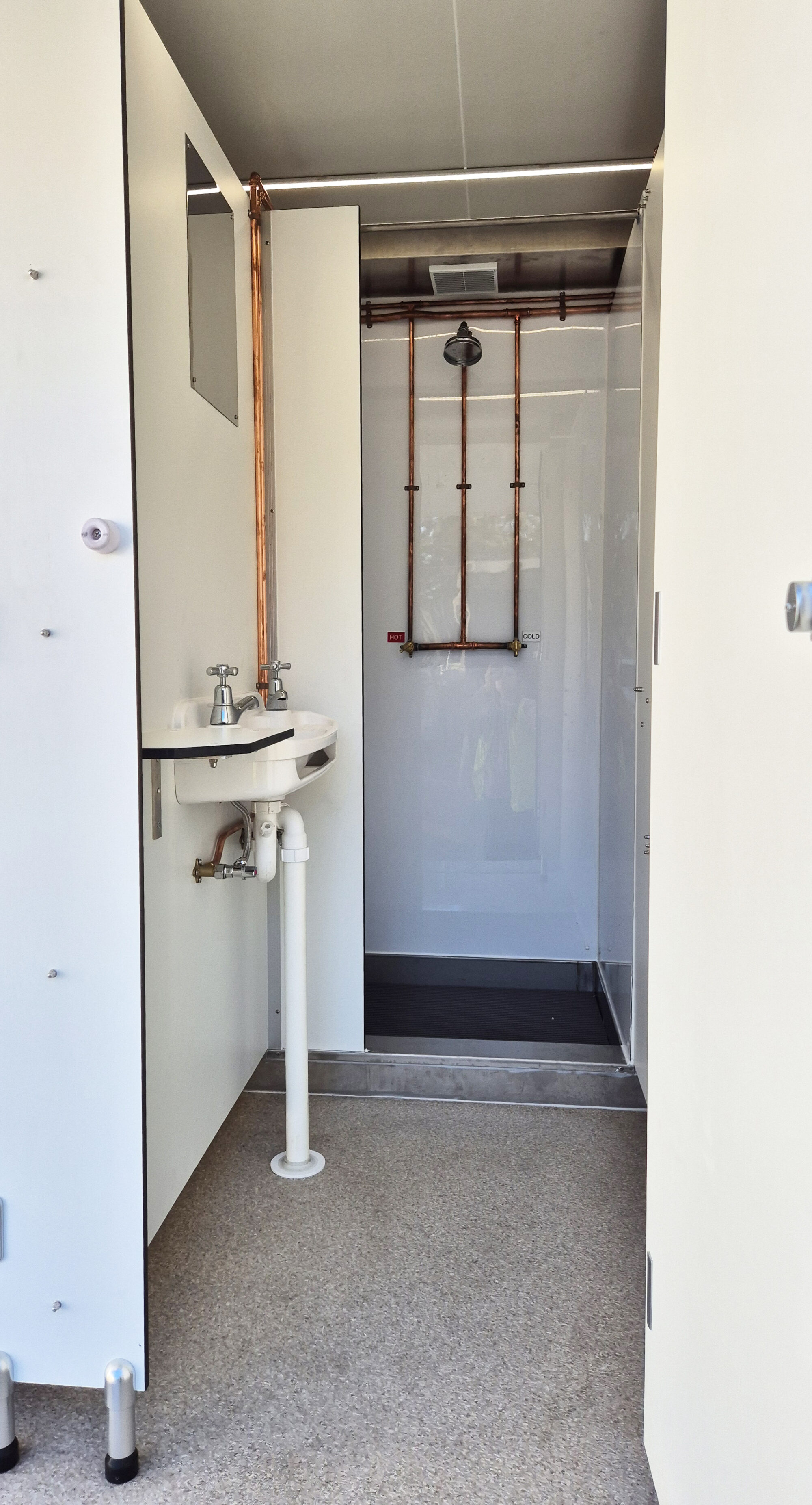 Each unit includes individual shower stalls with dry change areas, built-in sinks, clear identification signage and mirrors for personal comfort and hygiene. Features such as exhaust vents in each shower, environmental sealing, and slip-resistant commercial-grade flooring all support safety and performance in challenging environments.